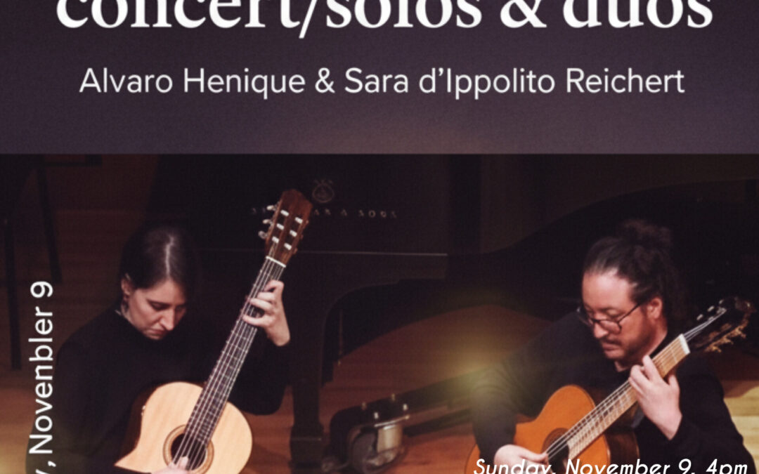 Join guitarists Alvaro Henrique and Sara D’Ippolito-Reichert for an afternoon of evocative music on Sunday, November 9, at 4:00 p.m., at Zion Community Church, 1697 Lafond Avenue, St. Paul, MN.